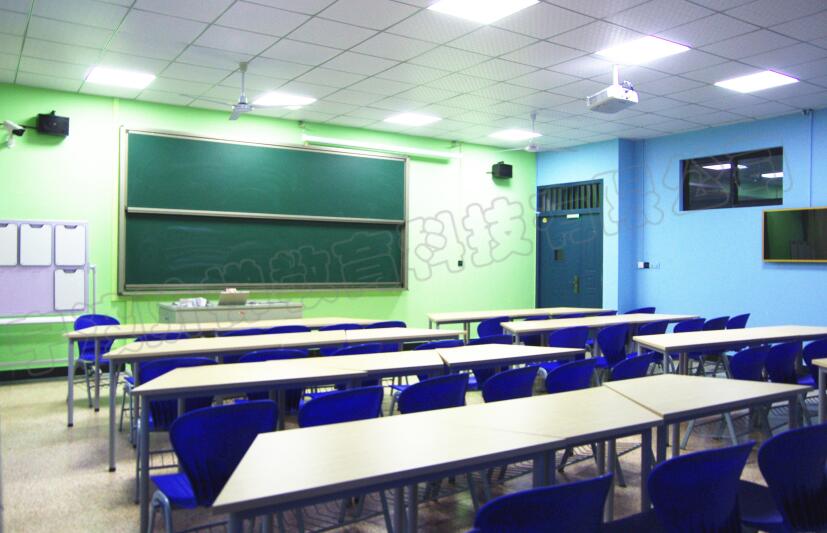 藍(lán)綠相間的清新色調(diào),讓這里的學(xué)習(xí)氛圍顯得格外的輕松愉悅。有別于傳統(tǒng)方式課桌,一張張?zhí)菪涡∽雷?,可自由拼接成圓形討論桌,有利于學(xué)生在課堂上的討論與互動(dòng)。